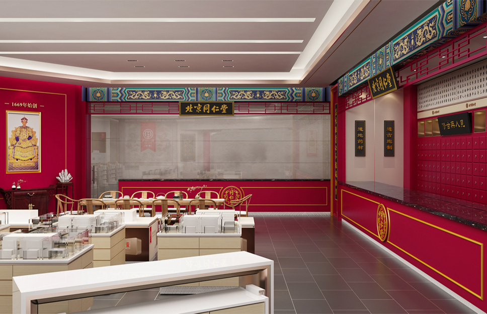 內部設計相比外部設計而言,涉及的設計元素更多,難度也更大。涉及的元素包括通道、柜臺、色彩、燈光、音樂、商品陳列布局等。我們依據同仁堂的文化屬性,強化空間布局及持續改善功能,讓顧客停下腳步,體驗、了解商品,實現產品動銷,門店增量。